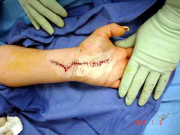 Предпочтительно сначала закрыть медиальную сторонну, а затем латеральную, потому что при невозможности закрытия кожных ран, наружную сторону легко закрыть кожной пластикой.