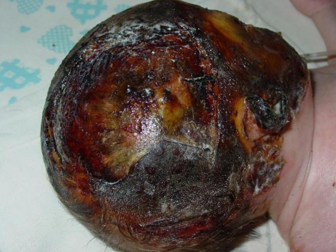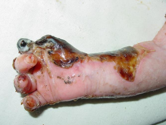 Лечение: анальгетики, противошоковая терапия, некроэктомия, тиенам, отмытые эритроциты, свежезамороженная плазма, местно левомеколь. Состояние ребенка стабилизировано.