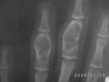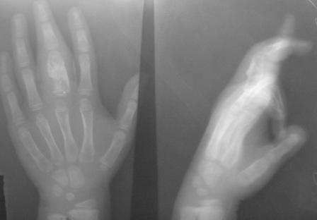 Уважаемые коллеги, на осмотре девочка 2006 г.рожд. Со слов матери 3мес. назад заметила припухлость основного фаланга 3-пальца, которая постепенно увеличилось до настоящего размера где-то в течении месяца, не болит, ребенка не беспокоит, признаки воспаления отсутствуют. Консультация онколога, биопсия - опухоль исключена (со слов матери), фтизиоортопед - тбс исключен. От основной фаланги 3 пальца к головке 4-пястной кости под кожей прощупывается хрящевидная ткань. Р-граммы от 10 декабря и 15 февраля, и фото прилагается. Что делать? Уважаемые коллеги, помогите! С уважением Абдурашид.
