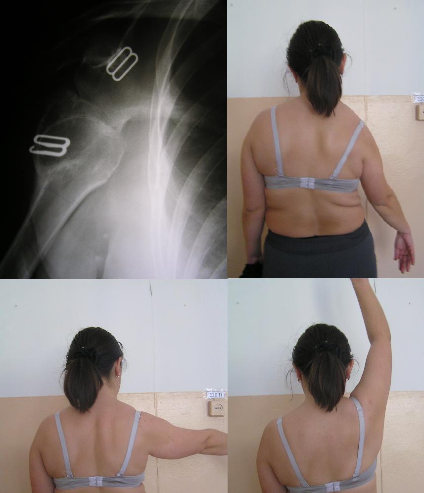 Нужен совет в тактике лечения.. и вобще - есть ли в нем необходимость. 1 год назад - переломовывих в плечевом суставе. Вывих толи был не вправлен, толи наступил повторно - неизвестно. На данный момент - движения ИСКЛЮЧИТЕЛЬНО за счет мобильности лопаточной кости. Отводящая контрактура. На фото показана полная амплитуда. Болезнености в суставе нет. Единственно что беспокоит больную - надоело носить руку "сбоку" от тела.Итак... варианты лечения которые представляются возможными:1)ничего не делать... что есть то есть2)остеотомия плечевой кости с кореекцией оси в выгодном положении (фиксация АЗФ или пластина)3)Артротомия с освобождением суставных поверхностей, устранением вывиха (если будет возможность). На счет восстановления движений - без комментариев.. выслушаю любые советы.Заранее благодарен всем откликнувшимся.