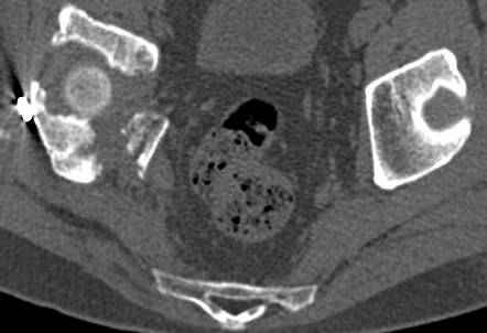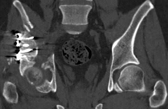 итак, второй вариант: высокий двухколонный с вовлечением КПС... Ни одно из основных повреждений не репонировано, кроме задней стенки. Скорее всего попытка реконструкции вертлуги сейчас будет очень травматичной и не очень эфективной, т.е. вероятный риск более значим, чем ожидаемая польза... Лучше подождать, и потом сразу эндопротез