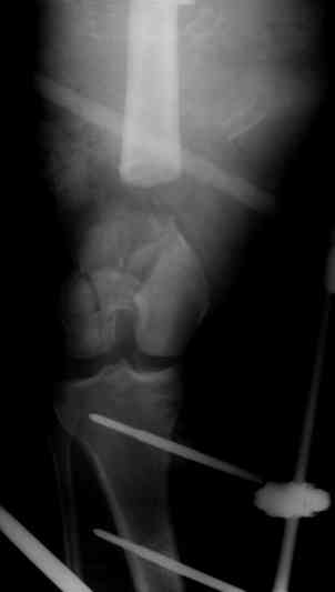 Если у Вас возникнут какие-то сомнения, то возможно наложение гибридного циркулярного-монолатерального дистракционного аппарата на левое бедро и выполнение остеотомии в в/3 бедра. Почему монолатеральный гибридный аппарат, а не аппарат Илизарова? Эта конструкция гораздо легче переносится пациентами, в ней гораздо удобнее проводить местное лечение ран.