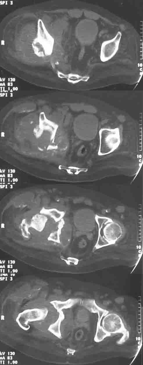 Приложите, пожалуйста, рентгенограму таза в добавок к КТ. Скорее всего вы имеете дела с инфекцией тазобедренного сустава и последствующим остеомиелитом. Повторите биопсию и пошлите ткань и внутресуставную жидкость на бактериальный анализ, включая туберкулёз.