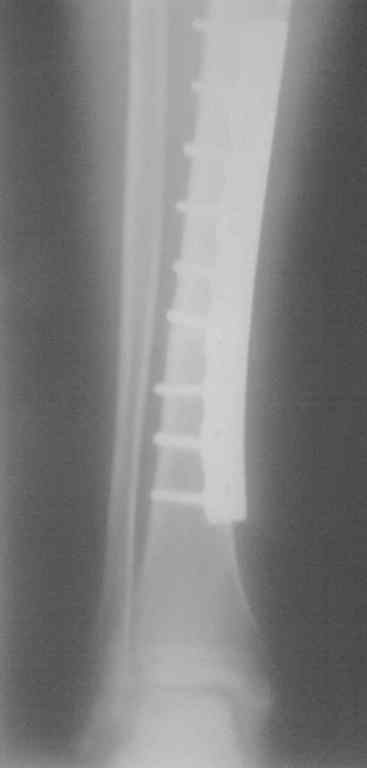 Малоинвазивно уберите промежуточные винты, оставляя крайные 6 винтов- по три на проксимальном и на дистальном отломках. После достижения консолидации уберете пластину и оставшиеся винты и рана тоже заживет.