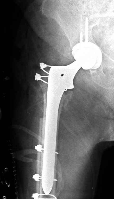 Вашему вниманию представляется похожий случай, пациентке 70, осложнился в течение одного месяца после операции. Ревизия с заменой сустава, кабельная фиксация на трохантер. При установке в дистальном диафизе обнаружен тонкий кортикальный слой и сделана профилактика от возможного перелома аллографтом.