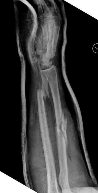 Множественная огнестрельная травма конечностей, перелом костей предплечья, фиксация в первые часы и дефект мягких тканей, мероприятия по закрытию...