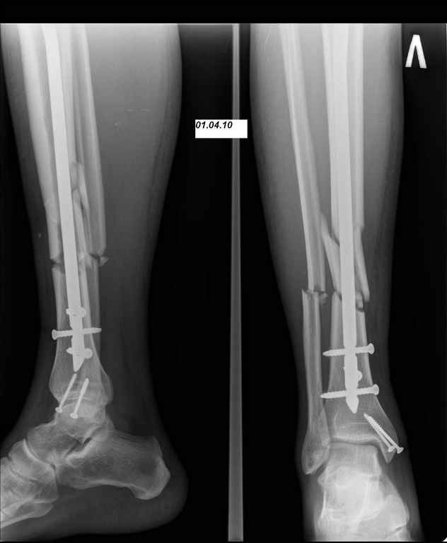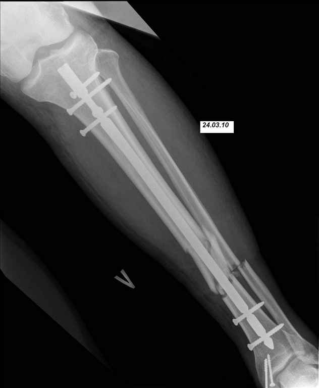 24.03.10 выполнены операции - БИОС перелома большеберцовой кости левой голени (штифт Synthes), остеосинтез перелома внутренней лодыжки левой голени винтами. Послеоперационный период протекал без осложнений. Выписан на 10 сутки. Амбулаторно не наблюдался.