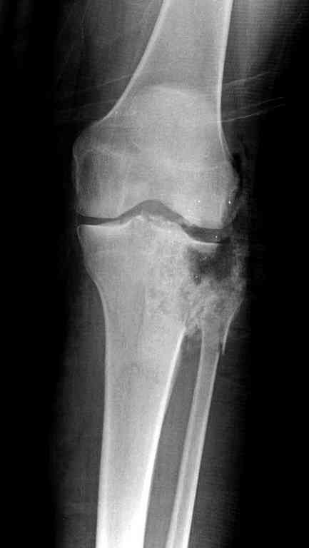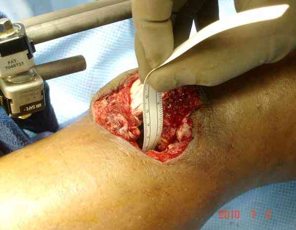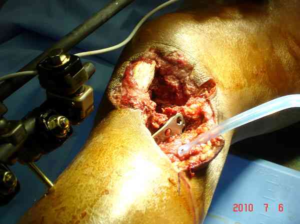 План с протезированием чересчур агрессивный, больная слишком молодая. В данный момент для удержания конструкции необходимо установить наружный фиксатор между бедром и голенью. Обработку продолжать с применением антибиотиков и вакуумирования.
