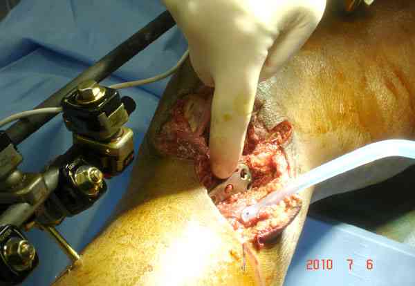 После нескольких обработок и вакуумирования, поэтапно сделана фиксация тибиального бугра шурупами. И окончательную фиксацию закончили латеральной пластиной для тибиал плато и установкой пластического материала.