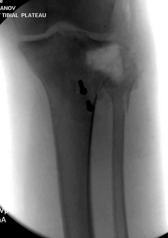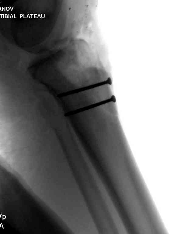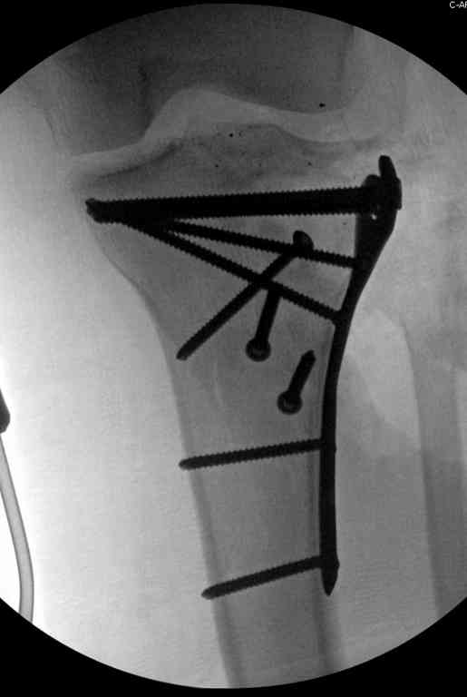 Одинокий кортикальный шуруп не удержит тибиальный бугор, сустав тибиал плато оставлен без репозиции и фиксации.
