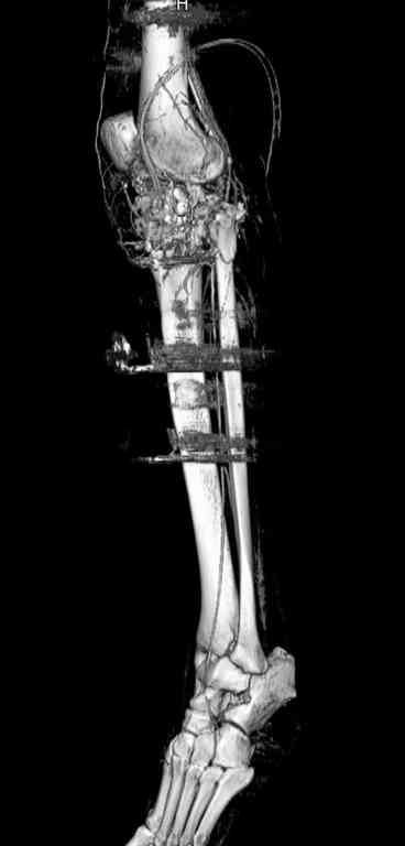 На первом этапе с задачей справляется наружный фиксатор, который создает благоприятные условия для закрытия ран и контролирует длину конечности. На данном этапе рекомендована КТ, чтобы увидеть топографию фрагментов для расчета направления фиксирующих элементов.