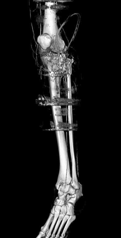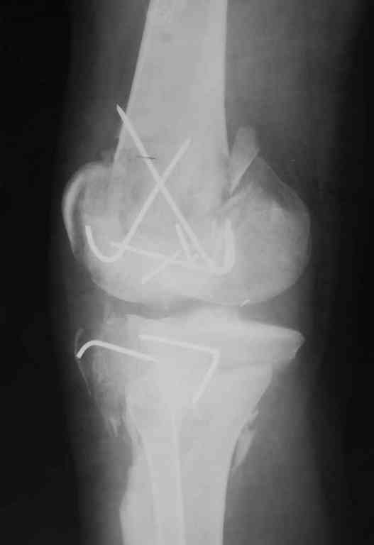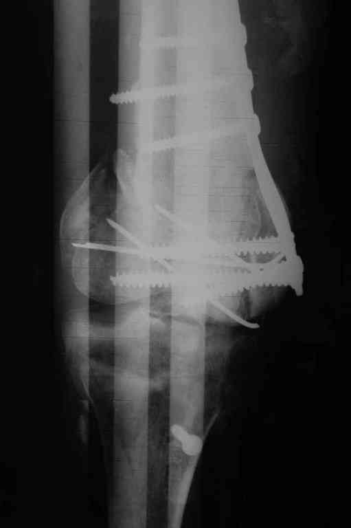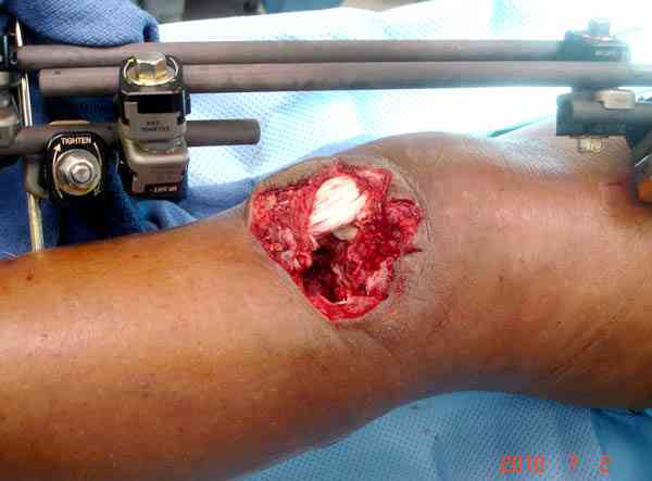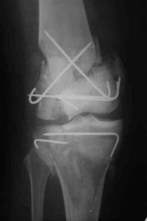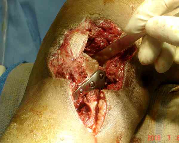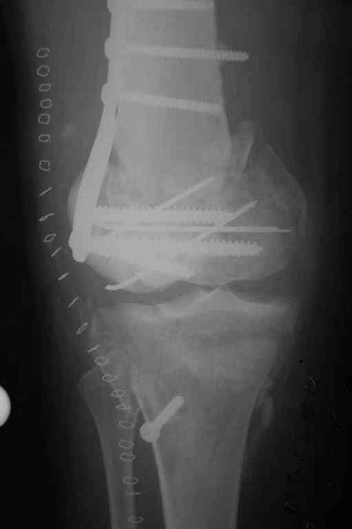 Поступила к нам пациентка 19 лет с диагнозом "Состояние после открытого многооскольчатого перелома дистального метаэпифиза правого бедра, проксимального метаэпифиза большеберцовой кости". Травма в июне 2010 года в Индии. ДТП. Тамошние доктора выполнили ПХО с удалением фрагментов латерального мыщелка бедра. Наложен АВФ. По возвращению в Украину через 1,5 месяца АВФ демонтирован. И так как смещение фрагментов бедра не устранено, было принято решение после заживление ран от стержней выполнить МОС. Не сколько для четкой анатомической репозиции сколько для подготовки к установке эндопротеза в будущем. Что и было выполнено 10 августа. Интраоперационная картина следующая. Дефицит практически всего латерального мыщелка бедра. Была выполнена попытка закрепить то что осталось от мыщелка, но он развалился на фрагменты. ВЫполнен ситуационный синтез спицами. Дефект заполнили бикортикальным трансплантатом из крыла подвздошной кости, МОС страйкеровским фиксатором. В послеоперационном периоде к 10 дню начались боли, гипертермия. Повышение СОЭ, лейкоцитоз. Посев крови транзиторная бактериемия золотистого стаф. Взяли в операционную. Выполнили дренирование сустава и области п\о раны. Получили гематому фактически с гноем. Температура нормализовалась. Назначили ванкомицин по 1000 мг 2 раза в день.который принимает с 28 августа по сей день. Температура нормальная, СОЭ на убыль. Посевы отделяемого стафилококк 2 ст активности. Но отделяемое по дренажам продолжает идти в достаточном количестве. Взял посев, сеется стаф. 3 ст активноси. К ванкомицину, понятно, слабочувствителен. Что в этой ситуации посоветуете? Менять антибиотик и продолжать бороться за фиксатор? В связи с раздражением синовии удалять нестабильные элементы остатка мыщелка, трансплантат и фиксатор с переходом на АВФ?Гентамициновые бусы? Надеюсь на скорый ответ. С уважением, Владимир Новиков. < | >