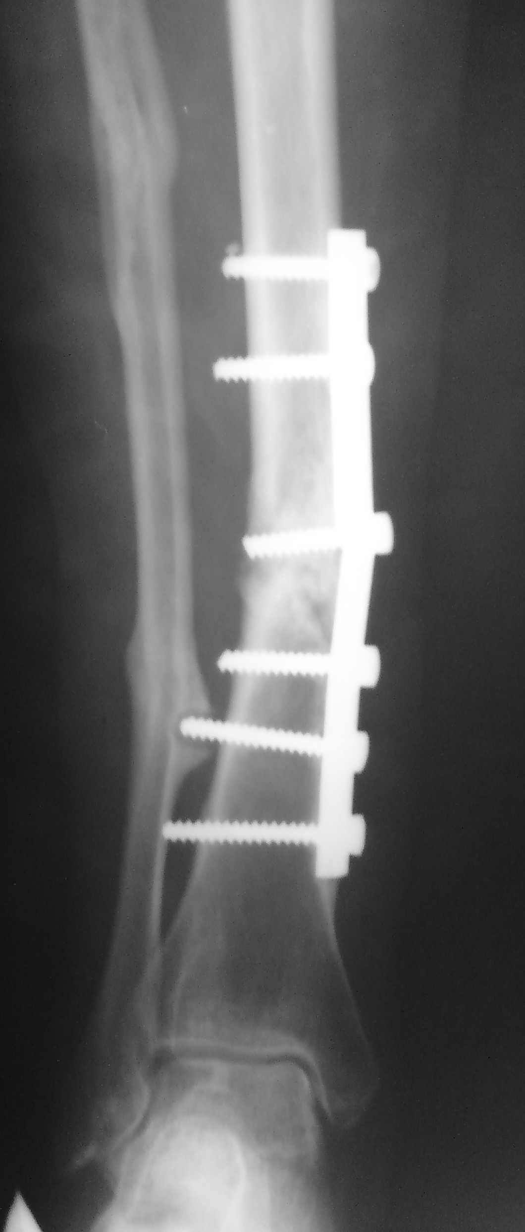 Мне кажется нужно делать то, чем лучше владеете. Или ставить более длинную пластину, желательно блокируемую, с остеотомией малоберцовой кости, костной аутопластикой и центральные винты подальше от ложного сустава. Или интрамедуллярный блокируемый остеосинтез. Тоже с остеотомией малоберцовой. А точно ложный сустав? По одной проекции и не скажешь. Иногда после перелома пластины срастается.