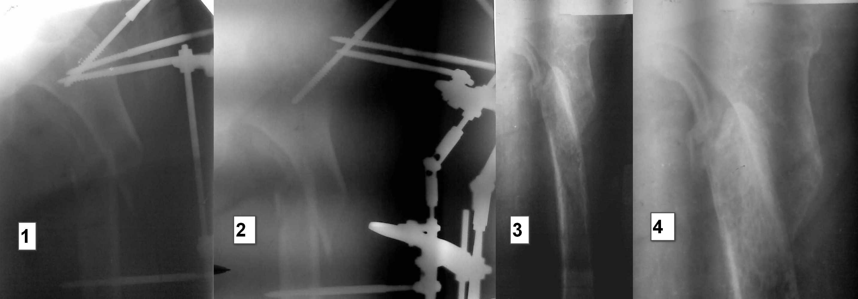В субботу проведна спица за бугристость ББК, вес 10 кг. Сегодня контрольные снимки - видимого удлинения в соотношении фрагментов нет, патологическая подвижность осталась. Больная тяжело переносит вынужденное положение, беспокоит боль в области перелома. Свищ с воскресенья не функционирует, признаков воспаления в проксимальном отделе бедра нет, лабораторные показатели в норме.