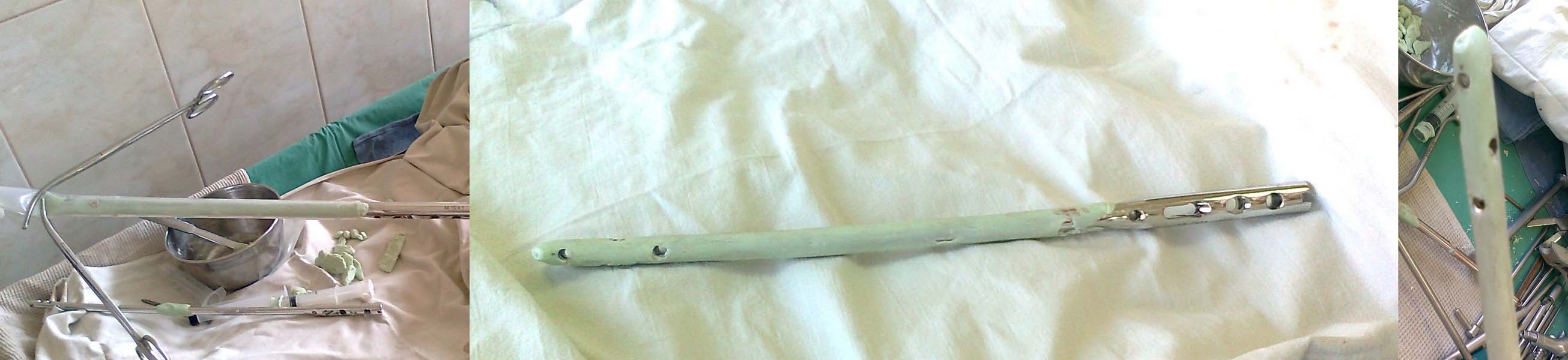 1. Цемент быстро полимеризуется. В цемент добавили 4 грамма амикацина в соответствии с приведеной на форуме ранее схеме, тщательно порошок цемента и АБ перемешали, после добавления жидкого компонента цемент сразу стал густым и в шприц набрать возможности небыло, сделали колбаску и руками ввели в трубку, после чего вввели стержень и в конце закрыли трубку зажимами. Шилом наметили отверстия для блокировки и двигали проводником в стержне. Время полимеризации около 3 минуты. После остывания цемента срезали трубку, которая отделилась от цемента без проблем, и по аналогичному стержню и по меткам шила сверлом востановили отверстия для блокировки. Место для проводника в дистальном конце стержня было запаяно цементом и рассверлено проводником, в связи с чем и возникла вторая проблема
