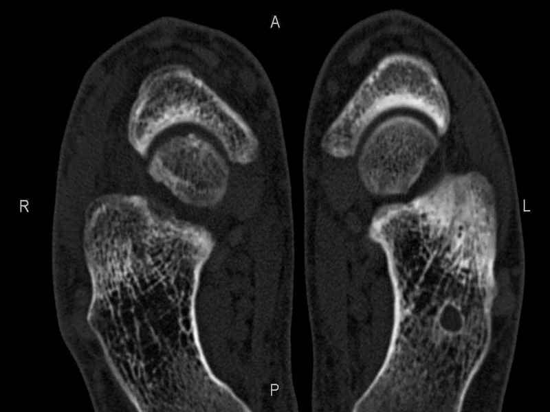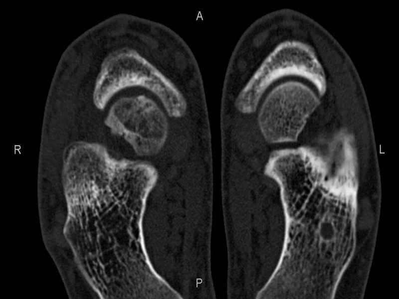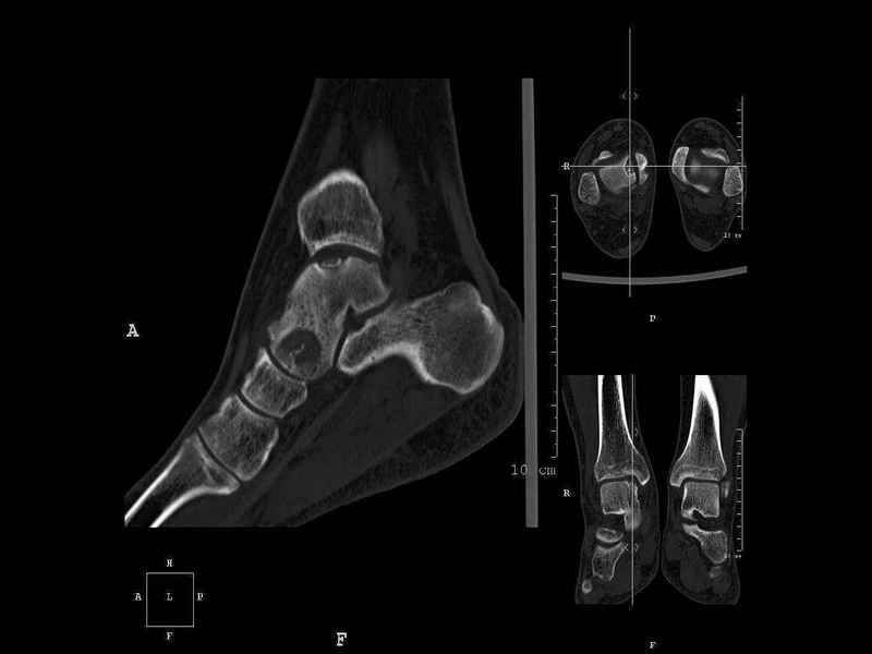 СТ чётко демонстрирует секвестр, но открыв сустав вероятно, что хрящ тарана окажется интактным и только пальпацией/ ЭОП можно будет