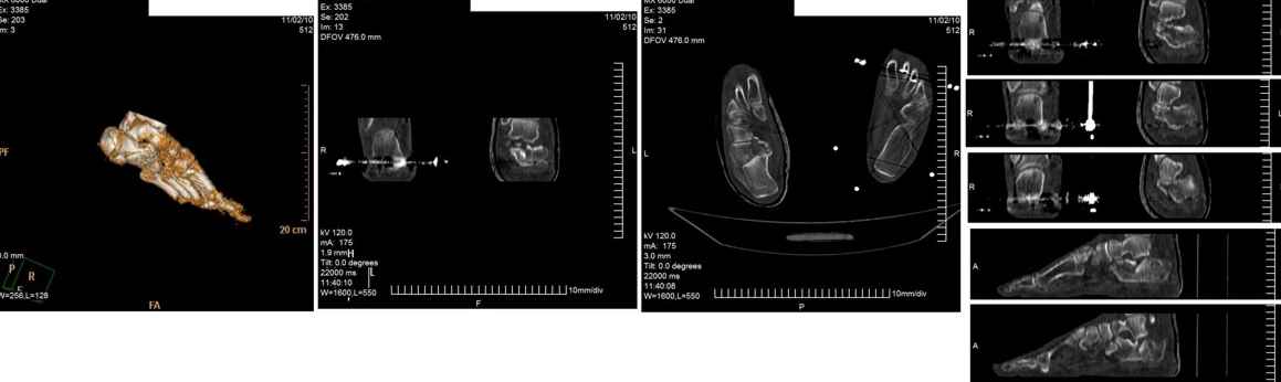 Во время операции была восстановлена суставная поверхность пяточной кости, после чего появилась надежда на восстановление нормальной функции подтаранного сустава. Кроме того, заполнена аутотрансплантатом критическая полость тела пяточной кости, которая хорошо вида на КТ.