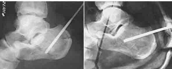 ORIF -единственный способ, позволяющий восстановить конгруэнтность подтаранного сустава, и «при всем богатстве выбора другой альтернативы нет (с)». Вопрос совершенно не в низведении бугра пяточной кости и восстановлении угла Белера – это элементарно делается и аппаратом, и даже еще более простым способом – в бугор в направлении ссади вперед вводится толстая спица, используя ее, как джойстик, бугор низводится, спица проталкивается еще глубже ( картинка из Кэмпбелла). Вот только «проваленную» заднюю суставную поверхность пяточной кости без ORIF and bone grafting не восстановить