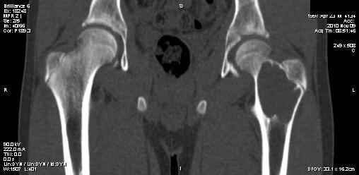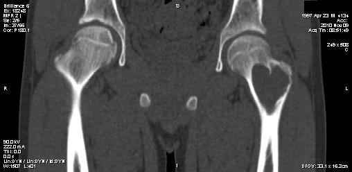 Ув. Сергей! Д-з: или солитарная киста, или аневризмальная (есть небольшое "вздутие") или остеобластома ( старое название "остеобластокластома"). Если 3 вариант то полость надо обработать спиртом или азотом. Предпочтительнее аутопластика из 2 подвздошных костей. Так как срок фикс. длительный то АВФ субоптимален. Предпочтительнее фиксация угловой нестандартной пластиной 110-115 град ("разогнутая" 95 град).В запасе минимум 3 пластины с 3 типоразмерами клинка (расстояние от tuberc. innominatum до перехода метаэпифиза в нижний полюс головки).Ножка: минимум 3 винта в "здоровой" кости диафиза.Перед формированием канала пробойником 3 "страховочные" спицы: большой вертел центр головки (межвертельный перелом лучше перелома шейки) Аутопластика после МОС.