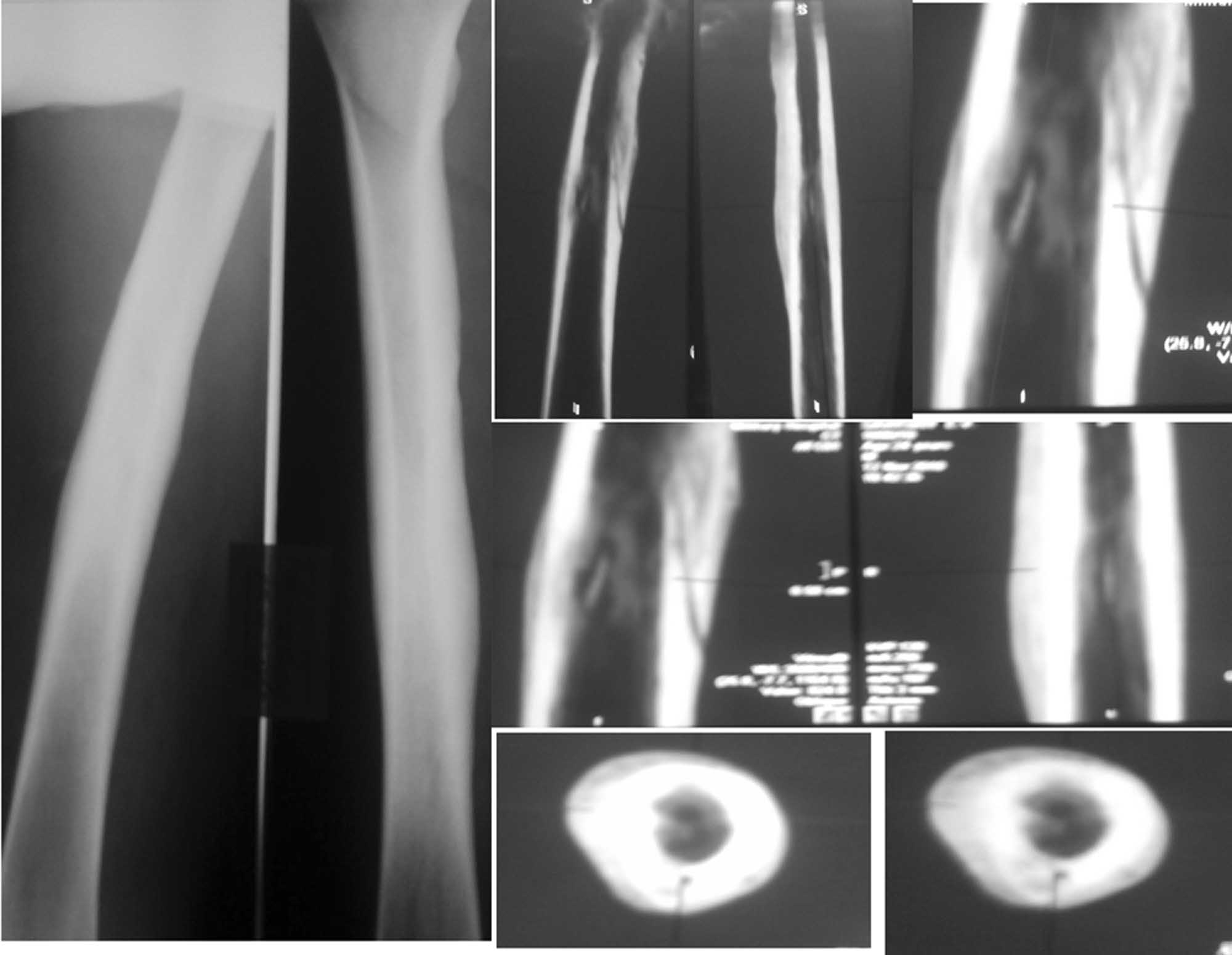 Случай «вялотекущего» гематогенного остеомиелита у молодого пациента 2 года назад без видимой причины появились боли и припухлость в нижней трети правого бедра. Был госпитализирован в отделение гнойной хирургии с диагнозом «Воспалительный инфильтрат». Рентгенограммы бедра в тот период патологии не выявили. На фоне а/б терапии цефазолином инфильтрат разрешился полностью. Последующие 2 года ничего не беспокоило. Около 2 недель назад появились боли и припухлость в нижней трети правого бедра, вновь без видимой причины. На рентгенограммах бедра выявлены выраженная периостальная реакция, на КТ признаки хронического гематогенного остеомиелита. Объективно: внешне мягкие ткани бедра не изменены, следов от свищей нет, умеренно болезненна область нижней трети правого бедра по медиальной поверхности, без изменения кожной температуры, признаков инфильтрации и флюктуации. Ограничено сгибание в правом коленном суставе до 90 гр из-за болей. Лабораторные данные без особенностей за исключением СОЭ – 25 мм в час, уровень СRP в 2 раза выше нормы. УЗИ мягких тканей изменения эхоструктуры тканей не выявило. Выполнение МРТ и сцинтиграфии не возможно в связи с отказом пациента. Вопросы: необходимо ли дообследование? Целесообразно ли консервативное лечение с учетом выявленной на КТ секвестральной полости?Возможные варианты оперативного лечения? < | >