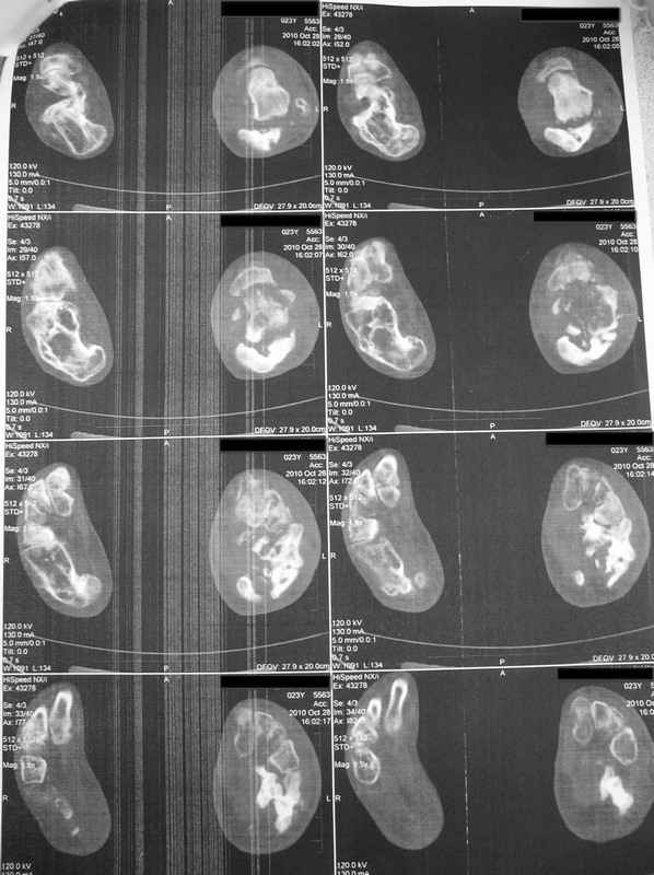 Больная Н., 25 лет, падение с высоты (2008 г.). Жалобы на боли в области голеностопных суставах, в области пяток при ходьбе. Лечилась в аппаратах внешней фиксации по поводу открытых оскольчатых переломов обеих голеней, переломов пяток. Далее по поводу несросшихся переломов голеней –ЧКОС аппаратами внешней фиксации. Переломы срослись, аппараты демонтированы весной 2010г. В левой пяточной области в месте проведения спицы имеется сукровичное отделяемое. При ревизии гноя нет. Чем помочь девушке?