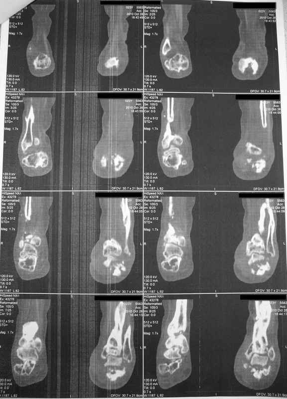 Молодая девушка со сросшимися многооскольчатыми переломами пяток и голеней.Young girl with fractures of the calcaneus Больная Н., 25 лет, падение с высоты (2008 г.). Жалобы на боли в области голеностопных суставах, в области пяток при ходьбе. Лечилась в аппаратах внешней фиксации по поводу открытых оскольчатых переломов обеих голеней, переломов пяток. Далее по поводу несросшихся переломов голеней –ЧКОС аппаратами внешней фиксации. Переломы срослись, аппараты демонтированы весной 2010г. В левой пяточной области в месте проведения спицы имеется сукровичное отделяемое. При ревизии гноя нет. Чем помочь девушке?