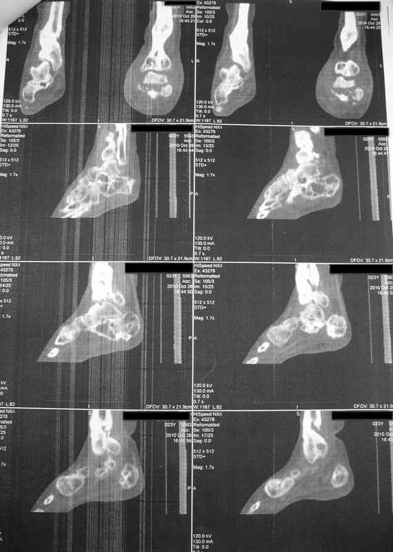 Patient N., age 25, falls from heights (2008). Complaints of pain in the ankles, in the heel when walking. She was treated by external fixation on open comminuted fractures of both legs, fractures of the calcaneus. Then she was treated by external fixation from nonunion of both legs. Now fractures are fused, apparatuses removed in the spring of 2010. How to help a girl?