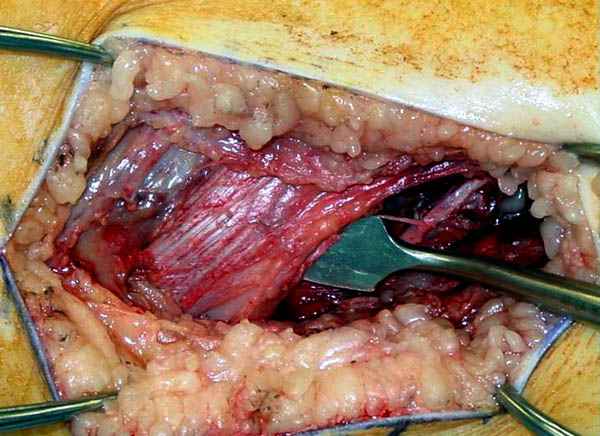 Доступ к медиальной стороне задний или медиальный, через pes или в пространстве между medial gastroc мышцы.