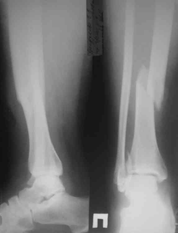 Представляю рентгенограмму перелома обеих костей голени, где определяется разрыв дистального межберцового синдесмоза.