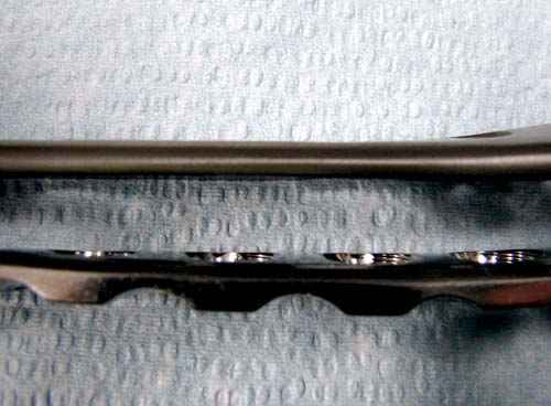 Данная фиксация пластинами сделана классическим АО методом описанным еще в 1989 году в книге J. Mast и R. Ganz “Planning and Reduction Technique in Fracture Surgery”. В то время antiglade method DCP пластиной в 4.5 мм c повторением натурального изгиба голени в н/3 считался одним из оригинальных. Повторение оригинальной концепции и фиксация спонгиозными шурупами в дистальном отделе доказывает, что коллеги хорошо освоили метод АО. Но для уменьшения раздражения пластиной изнутри в нижнем отделе, авторы применяли технику погружения пластины в кортекс. Профилактические меры не всегда помогали, и в неумелых руках "передне-медиальный АО доступ" часто осложнялся кожными осложнениями.