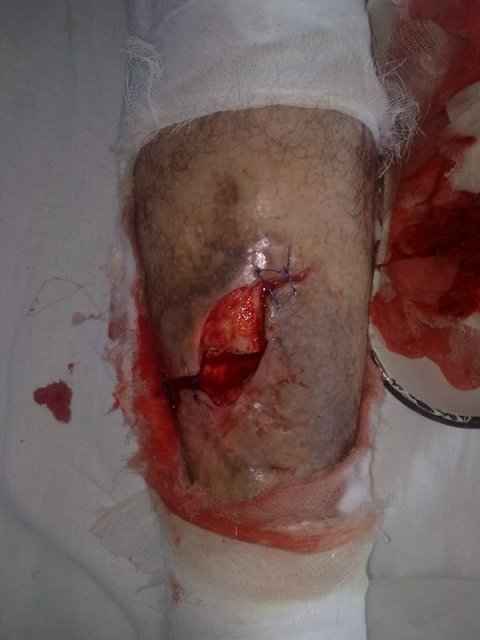 Уважаемые коллеги!Прошу помочь определиться с тактикой ведения пациента Мужчина, 41 год, обычного телосложения, доставлен в больницу 12 января 2011 года вследствие травмы, полученной при падении на улице.Около 2 лет назад перенёс подобную травму, был прооперирован, п/о период осложнился развитием посттравматического остеомиелита. голень была фиксирована спице-стержневым аппаратом ЧКДО, около года больной отходил в аппарате + была выполнена пластика дефекта кожи по передней поверхности голени кожно-мышечным лоскутом (со слов больного).Год назад аппарат был снят. Рекомендуемые курсы по лечению остеомиелита больной не проходил.После поступления больного, в ургентном порядке была выполнена ПХО раны с иссечением свища, первичная обработка кости, рана обколота р-ром антибиотика. Интраоперационно отмечались следующие моменты: края раны, по сути, не являются кожей, а, скорее, атрофическим рубцом, который возник после пластики. При экономном иссечении краёв не наблюдалось даже капиллярного кровотечения. На фото видны тёмные участки вокруг раны - это всё и есть обширный атрофический рубец.Кость склеротически изменена, костно-мозговой канал закрыт.После ПХО конечность иммобилизирована глубокой гонитной гипсовой лонгетой.Сейчас, насколько это возможно, проводится антибиотикотерапия (финансовая сторона вопроса), выполняются перевязки. Закрыть рану свободной пластикой не представляется возможным. Кровь пока что "спокойна", как и ткани вокруг раны, как и показатели биохимии (мочевина, креатинин).В понедельник будет взят посев крови на стерильность.От госпитализации в специализированные учреждения больной категорически отказывается, ссылаясь на финансовую сторону вопроса. Сам настаивает на ампутации на уровне верхней трети голени.Я лично предполагаю 2 варианта: резекцию большого участка б/б кости с пластикой дефекта участком м/б на питающей ножке + ЧКДО, но тут есть 2 "но": м/б также сломана + это уровень специализированного отделения, на которое, как я повторюсь, у больного нет средств.Вариант №2 - ампутация и дальнейшее протезирование.Что бы Вы сделали в моем случае?Заранее благодарен за ответ.С уважением,Влад Козанчук,Маньковская ЦРЛ, Украина