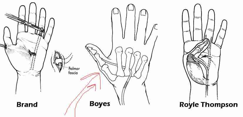Операция Zancolli и Thompson на 4 и 5 пальцев для устранения когтеобразной деформации, затем операция Royle и Thompson направлена на противопоставление большого пальца , и наконец восстановление абдукции указательного пальца с помощью собственного разгибателя этого же пальца; естественно все три операции за один раз.