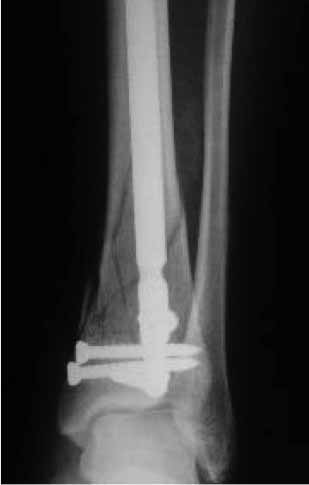 Частота ложных суставов и повторных смещений костных отломков после оперативной стабилизации переломов пилона доходит до 30%. Каждый, кто занимается лечением таких повреждений, наверняка сталкивался с такими осложнениями. Однако лечить такие осложнения в моральном, да и в оперативном плане проще, чем свежие переломы пилона (особенно Ruedi III), поскольку к этому времени становится более или менее понятной судьба голеностопного сустава. Если в достаточной мере владеете блокированным остеосинтезом, то самым оптимальным вариантом, с моей точки зрения, будет следующий. С переднемедиального и латерального доступов выполнить поперечную остеотомию большеберцовой и малоберцовой костей в плоскости параллельной плоскости голеностопного сустава на расстоянии около 3 см от самого сустава. Это минимальное расстояние, которое позволит расположить три блокирующих винта стержня. Важен выбор самого стержня. В данном случае больше всего подходит стержень ChM, имеющий на дистальном конце помимо отверстий в сагиттальной и фронтальной плоскостях и отверстия под углом в 45 градусов, причём на минимальном расстоянии друг от друга. Остетомию и последующую репозицию костных отломков мы выполняем в репозиционном спицевом аппарате. Стержень антеградный. В данном случае не вижу никаких оснований в применении ретроградного стержня, проходящего через здоровый подтаранный и через голеностопный сустав с его до конца неопределённой функцией. Образовавшийся дефект по переднемедиальной поверхности должен быть заполнен костным трансплантатом. Пример похожего случая из нашей практики - в приложенном файле.