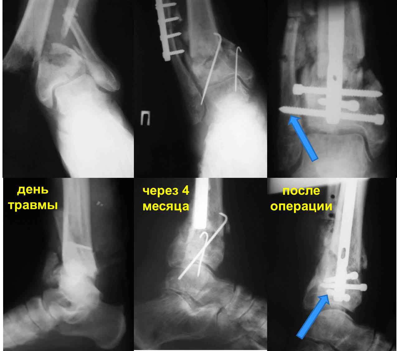 "На сегодняшний день, стандартом лечения переломов pilon являются протоколы, включающие ... Голеностопный сустав фиксируется в аппарате 6-12 недель, после чего начинается его разработка, общий срок фиксации в аппарате 12-16 недель, а для переломов проникающих до диафиза – 6 месяцев."