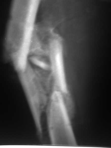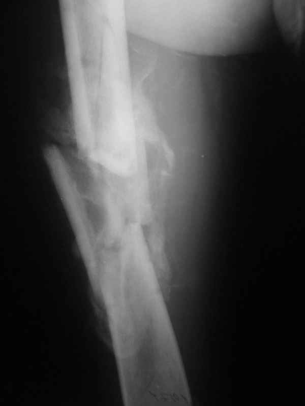 Можно закрыто мобилизовать отломки, наложить дистракционный аппарат, восстановить ось и длину, да и заштифтовать, на всякий случай с антибиотиковым цементным покрытием.