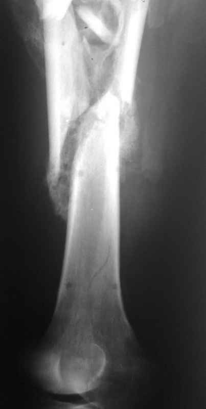 Неправильно срастающийся оскольчатый перелом бедра |