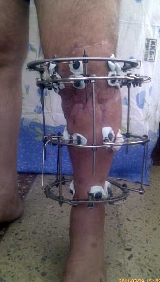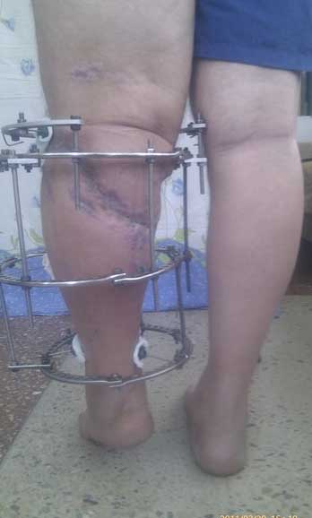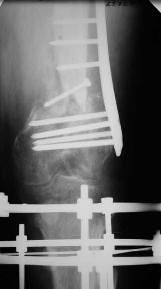Уважаемые коллеги. Хотелось бы услышать Ваше мнение по следующему случаю. На лечении в отделении находится пациент 45 лет. С диагнозом: Замедленно консолидирующийся надмыщелковый перелом левой бедренной кости фиксированный пластиной от 06.12.10. Ложный сустав большеберцовой кости левой голени фиксированный АНФ от 06.12.10. Жалобы: на невозможность активного сгибания в левом коленном суставе, нарушение опорной функции левой нижней конечности, укорочение левой нижней конечности на 5,0 см. Анамнез: травма 18.06.10 в результате ДТП, водитель. Диагноз: Сочетанная травма головы, конечностей. ЗЧМТ. Сотрясение головного мозга. Открытый многооскольчатый внутрисуставной перелом мыщелков и нижней трети левой бедренной кости со смещением отломков. Открытый перелом костей левой голени в верхней трети со смещением отломков. Обширные рвано – ушибленные раны левого бедра, верхней трети левой голени. Находился на лечении в нескольких стационарах, где проводились оперативные вмешательства. 1. 18.06.2010 г. - ПХО открытого перелома костей левой голени, фиксация переломов костей левого бедра, голени в АНФ. 2. 08.07.2010 г. перемонтаж АНФ на левом бедре, голени, хирургическая обработка ран левой голени 3. 13.07.2010 г. кожная пластика гранулирующей раны левой голени перемещенным кожным лоскутом и свободная кожная пластика расщепленным кожным лоскутом. 4. 27.07.2010 г. перемонтаж АНФ на левом бедре, голени, вторичная хирургическая обработка ран левой голени. 5. 09.08.2010 г. – свободная кожная пластика гранулирующей раны левой голени. 6. 01.12.2010г.: Демонтаж АНФ с левого бедра, голени. 7. 06.12.2010г. Открытая репозиция, остеосинтез чрезмыщеково – надмыщелкого перелома левой бедренной кости пластиной со свободной костной пластикой из гребня левой подвздошной кости (во время операции из за сомнений в жизнеспособности костного отломка перелома бедра произведено его удаление. За счет чего образовался дефект костной ткани и укорочение левого бедра на 5,0 см; Мыщелки бедра были в сгибание, 5 месяцев нога не опорная, при попытке их репонировать крошились , зафиксировали как стояли. Остеосинтез переломов костей левой голени в АНФ. Местно: Ходит при помощи костылей с попыткой полной нагрузки на левую ногу. Левый коленный сустав в положении разгибания. Движения в коленном суставе качательные. Воспалительных явлений области послеоперационных рубцов, мест выхода спиц нет. Анализы крови без воспалительной реакции. На сегодня: с момента травмы прошло 10 месяцев. Вопрос, что делать: 1. С бедром. 2. С голенью. 3. С коленным суставом. Мысли: №1. Оперативное лечение провести в два этапа. В первый этап голень, второй этап через 1 месяц бедро и коленный сустав. Голень: выполнить остеосинтез левой большеберцовой кости интрамедуллярным стержнем с рассверливанием. На основании боковой рентгенограммы коленного сустава мыщелки бедра в сгибании, голень в переднем подвывихе, создается впечатление, что удастся завести стержень при такой контрактуре, или выполнить отсечение бугристости, попытаться согнуть колено и заштифтовать. Есть ли опыт штифтования при стойких контрактурах? Бедро, коленный сустав: через 1 месяц срединным доступом с отсечение бугристости большеберцовой кости произвести реостеосинтез надмыщелкого перелома бедра с выведением мыщелков из сгибания. Коленный сустав: мобилизация головок четырехглаво