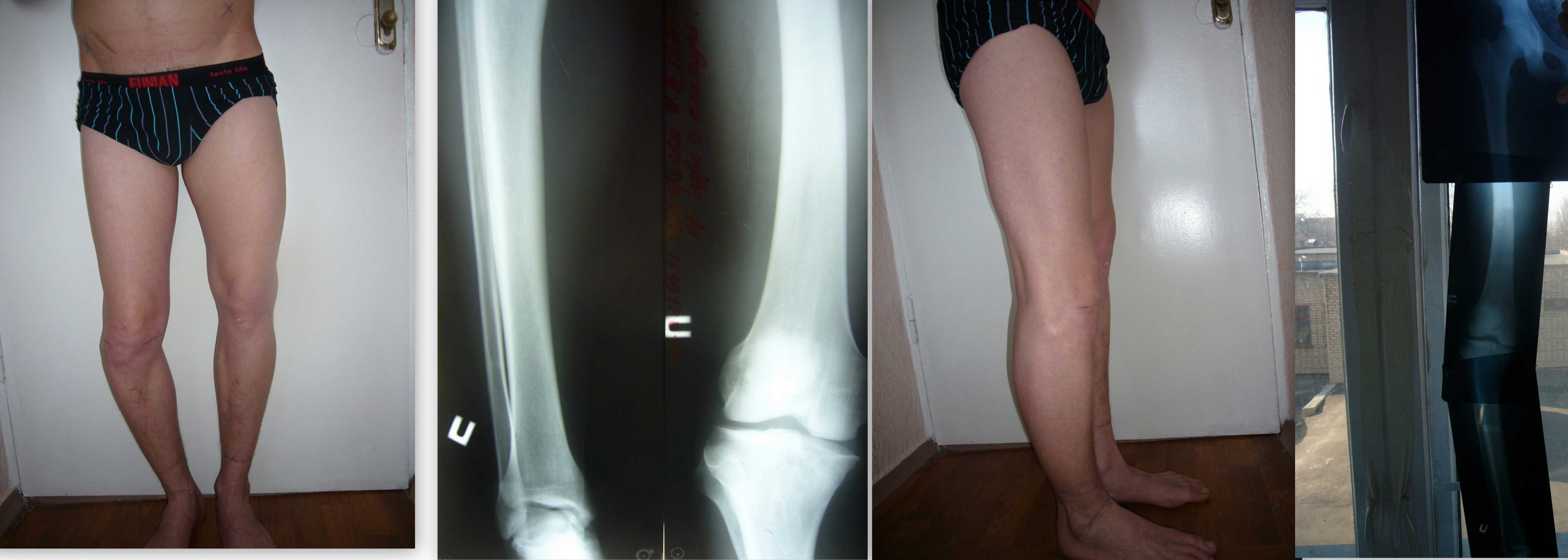 Здравствуйте уважаемые коллеги! К нам обратился интересный больной. Парень 25 лет. В детстве перенёс гематогенный остеомиелит правой голени и бедра. До 5 лет частые флегмоны бедер и голени. Соматически сохранен, укорочение до7 см. правой нижней конечности. Планируем аппаратное устранение с остеотомией голени и бедра.