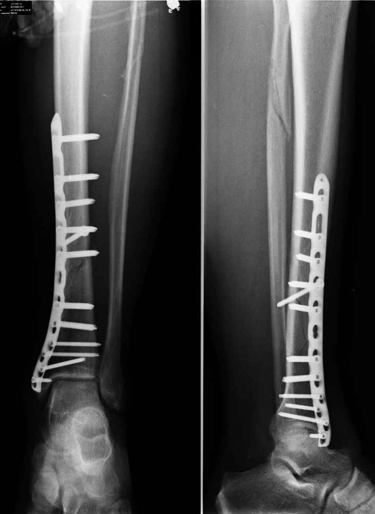 самый дистальный шуруп насквозь через внутреннюю лодыжку в сустав ( см увеличенный рисунок). Хорошо было бы его убрать - стабильности остеосинтезу он совершенно не добавляет.
