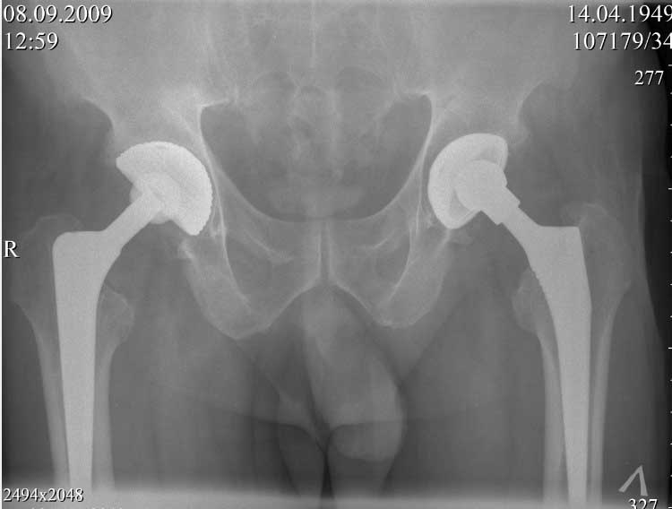 В конце 2008 года отметил боли в правой паховой области при опоре на правую ногу. На рентген снимках таза с тазобедренными суставами явных признаков нестабильности вертлужного компонента не обнаружено. В 2009 году нейрохирурги его "успешно" прооперировали на L\3-\4 связывая болевой синдром в правой паховой области с наличием грыжи указанного межпозвонкового диска. Состояние только ухудшилось, больной уже не мог долго сидеть, боль прогрессировала . Его в 2009 и 2010 годах смотрел ортопед, делались рентгенснимки, но почему то приходили к выводу что эндопротез справа стабилен. В марте 2011 года я впервые увидел его, через одну неделю после этого был прооперирован. На операции вертлужный компонент при упоре на него инструментом прокручивался во впадине и без труда был извлечен.
