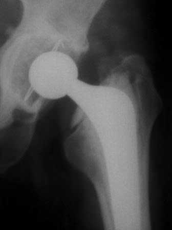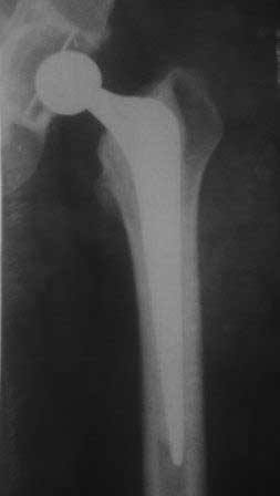 Если не ошибаюсь, то у больной имеется нестабильность бедренного компонента эндопротеза. Стартовые ("помповые") боли, а также зона просветления вокруг цемента и смещение цемента относительно кости...