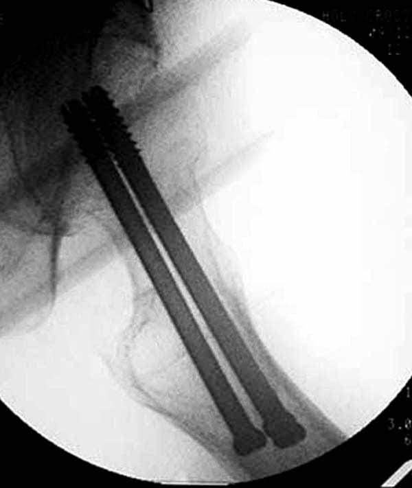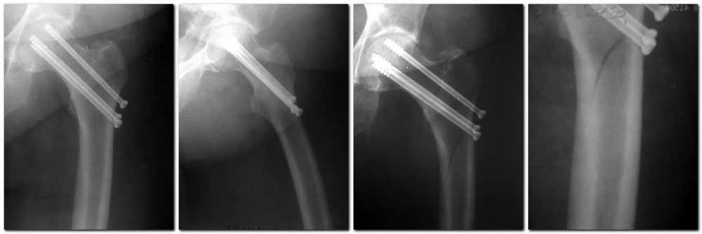 два в нижней части шейки. Более стабильная структура как раз обратная: два шурупа в проксимальной части шейки , и не дальше центральной части головки, иначе есть риск пенетрации. дистальный винт мог бы быть выше уровня малого вертела. Его дистальное расположение описано с увеличенным риском послеоперационного перелома.