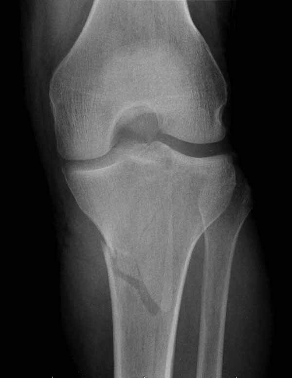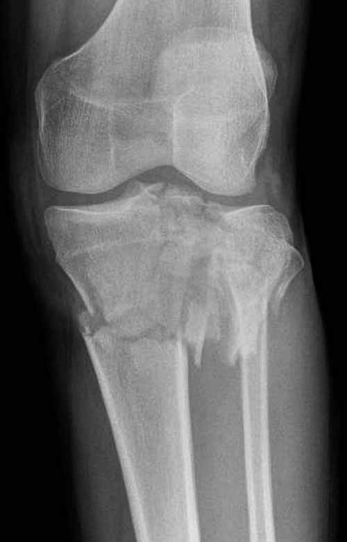 Двухколоннный перелом тибиал плато с вовлечением проксимального диафиза. Внутрисуставной компонент без смещения, и такой перелом можно лечить любым из описанных методов, о которых говорят наши коллеги.