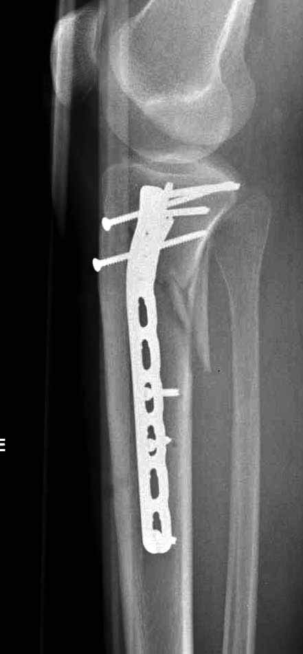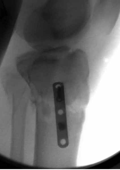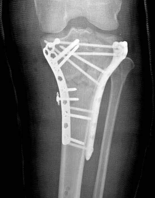 "участок некроза кожных покровов (см. фото), поэтому латеральная мыщелковая пластина не подойдет, а медиальных пластин у фирм-производителей нет. Пациент может приобрести современный имплант, но какой?"