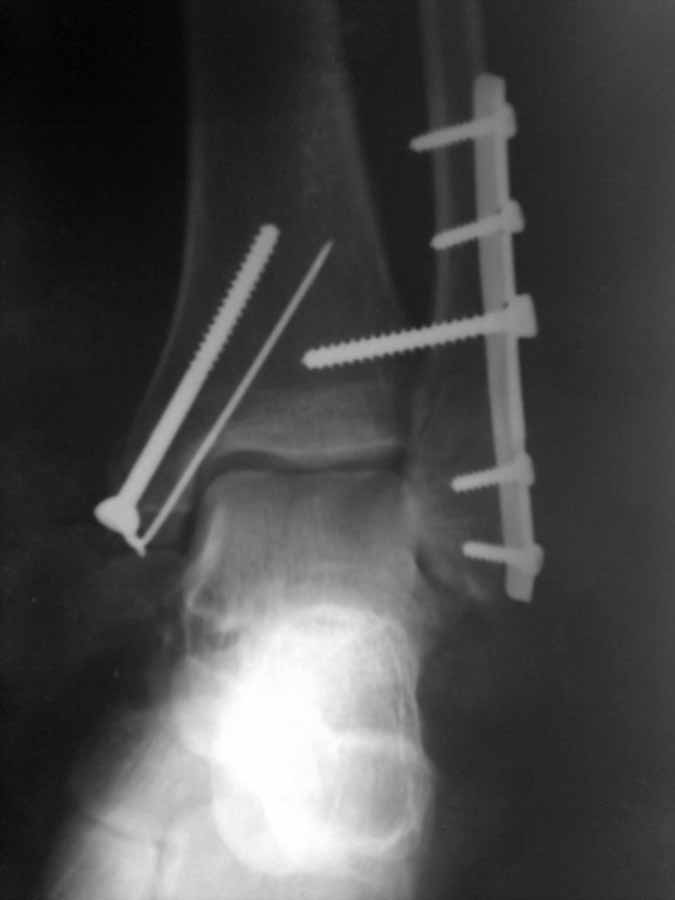 Тем не менее, смущает отсутствие стягивающего винта, который должен был быть проведен перпендикулярно плоскости перелома наружной лодыжки в передне-заднем (или обратном) направлении. Тогда 1/3- трубки работает как нейтрализующая пластина. Без стягивающего винта она никакая - ни компрессирующая , ни нейтрализующая. Она просто слабая. Второе, мы ни чего не знаем о межберцовом винте. Нужен ли он был вообще? На каком этапе он был введен? Как подготавливались отверстия перед его введением? При пристальном рассмотрении имеющегося снимка создается впечатление, что этот винт работает как стягивающий, а не как позиционный, удерживающий, и имеется избыточное сдавление синдесмоза и из-за этого смещение тарана кнутри на 1-1,5 мм, что не позволило идеально отрепонировать медиальную лодыжку.. Хотя с последней проблем меньше всего.