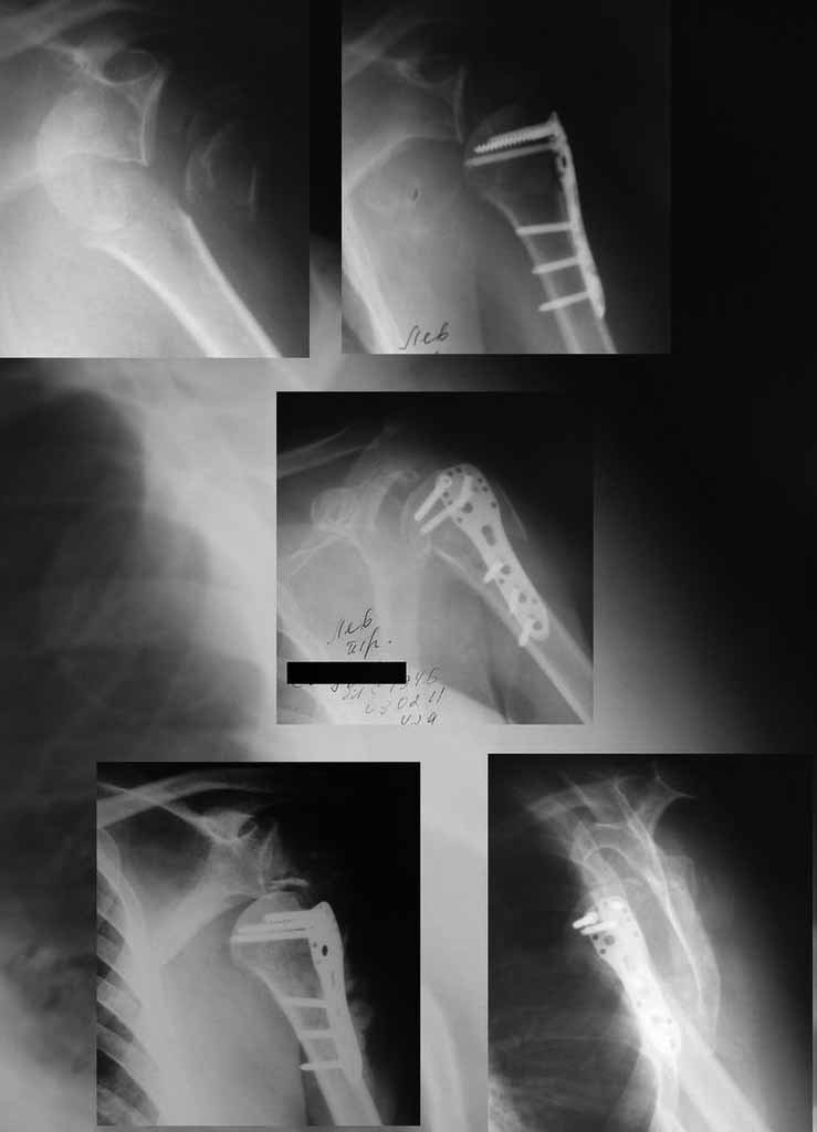 Уважаемы коллеги! Прошу помочь определиться с тактикой лечения пациентки. В феврале в отделение поступила пациентка с оскольчатым переломо-вывихом головки плечевой кости. Выполнена операция -остеосинтез блокируемой пластиной. Костная пластика не производилась. На контрольных рентгенограммах остается сублюксация головки и смещение большого бугорка. Интраоперационно бугорок подшивался с помощью лавсановых нитей. Послеоперационно: ношение косыночной повязки и пассивные движения в плечевом суставе в течение 2,5-х месяцев без особенностей. Через 2,5 месяца при попытке выполнения пассивно-активных движений произошел передний вывих плечевой кости.Вся реабилитация производилась по месту жительства. Таким образом существование вывиха в течение 1 месяца. Боли не беспокоят. Нейрососудистых нарушений в конечности нет. Что вы можете посоветовать: пластику, эндопротез, артродез? Заранее спасибо.