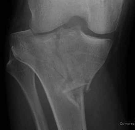 На снимке типичный перелом медиального тибиал плато с передним смещением (подвывих) по Schatzker IV. Консервативное лечение без медиальной опоры не может удержать деформирующие силы, и из-за вторичного смещения мыщелка конечность смещается в варус. Кроме передних смещений еще встречаются сложные фронтальные варианты переломов, и тогда голень подвывихивается кпереди.