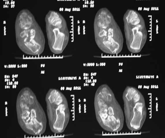 Пациент 60 лет с производственной травмой-закрытые переломы правой пяточной кости, тибиального плато слева поступил в феврале с.г. На 4 сутки выполнена открытая репозиция, остеосинтез внутрисуставного перелома голени, ручная репозиция пяточной кости. Через три месяца начал ходить с нагрузкой на обе ноги. Консолидация голени с полным восстановлением функции колена. Правая стопа умеренно отечна, продольно распластана, длительная ходьба вызывает боли и увеличение отека. Прошел несколько курсов ударно-волновой терапии, грязелечение, боли и отек уменьшились. В наших планах -оформление на ВТЭК, через год возможно выполнение подтаранного артродеза.Но после производства КТ в августе появились сомнения в консолидации перелома.Ранее у нас не было опыта КТ переломов стопы и сканы привели в замешательство.Прилагаю снимки со дня поступления, августовские пациентом не представлены.С благодарностью примем советы коллег.