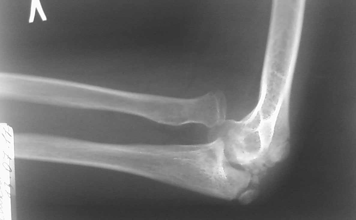 На рентгенограмме. Нарушение пропорциональности дистальных структур плечевой кости не отмечается. Объемная деформация головки лучевой кости не визуализируется, отмечается передневнутренний вывих головки лучевой кости. Отмечается нарушение сферичности локтевой вырезки, объемный дефицит суставной поверхности, который привел к объемному конфликту в плечелоктевом суставе, став причиной ограничения сгибания. Гипертрофия венечного отростка, увеличение ширины локтевого отростка в боковой проекции. Все эти изменения свидетельствуют о перенесенном переломе в области локтевого отростка.