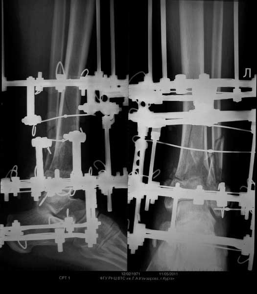 Спасибо уважаемому Джолдасу за ссылку на мою грешную личность. Мое мнение следующее. Уважаемый Сергей! Если Вы хорошо владеете методом чрескостного остеосинтеза, то можете приступать к делу не задумываясь. На рентгеновских снимках созерцаю картину, из которой можно получить наилучший результат именно внешним остеосинтезом. Слова типа "собирать аппарат нудно и т.п", наверное, не совсем к месту. Подарите человеку полное здоровье и, как говорил ныне покойный Леонид Ильич, Вы получите чувство глубокого удовлетворения. И уважения. В данном случае травматичные методы вмешательства могут весьма негативно сказаться на и так подорванных остеогенных потенциях тканей и иметь непредсказуемые последствия. А еще лучше - пришлите пациента к нам в Курган. Обещаем выставить результаты лечения на всеобщее обозрение.